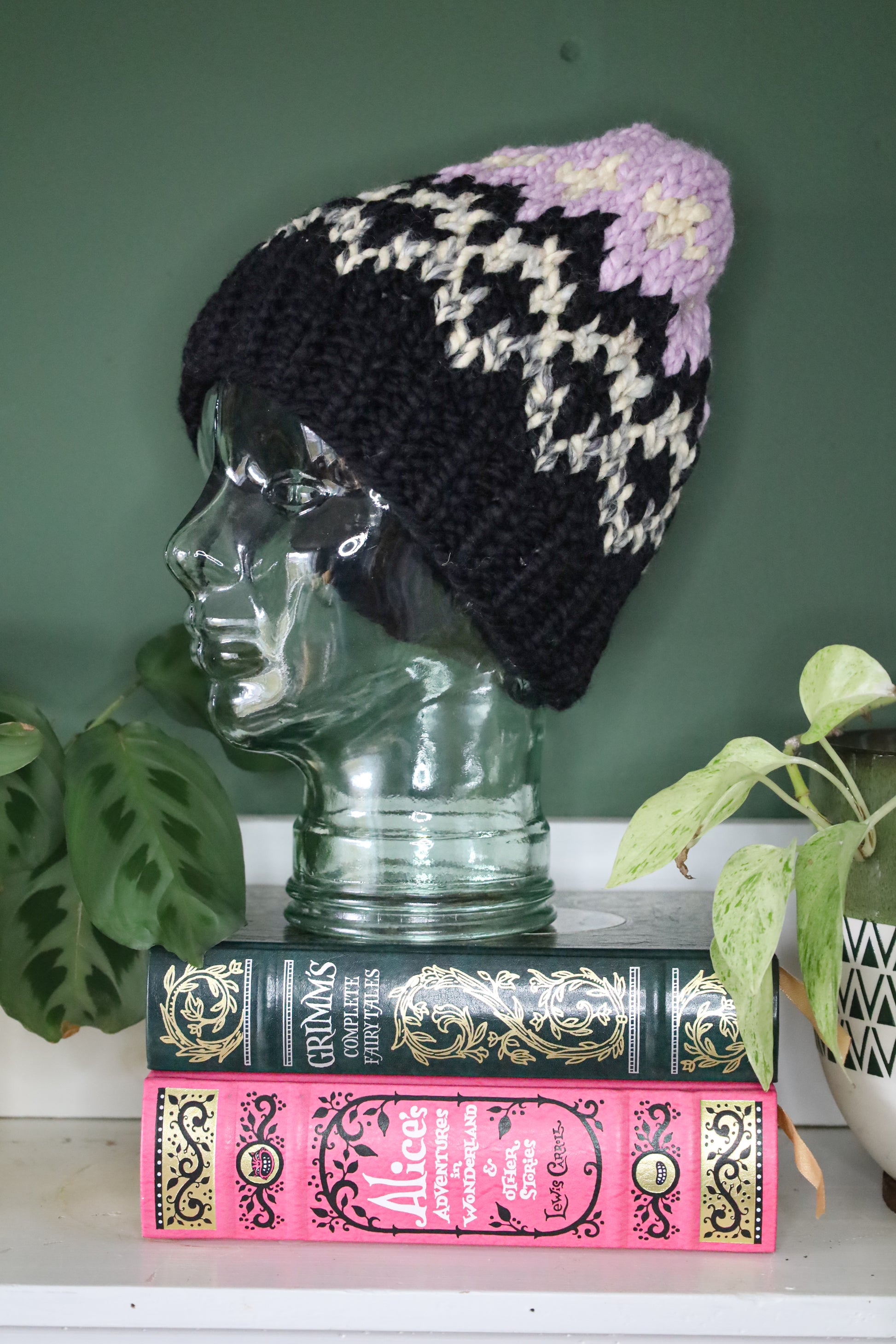 One size fits most, 80% acrylic, 20% wool. Machine wash cold, lay flat to dry.